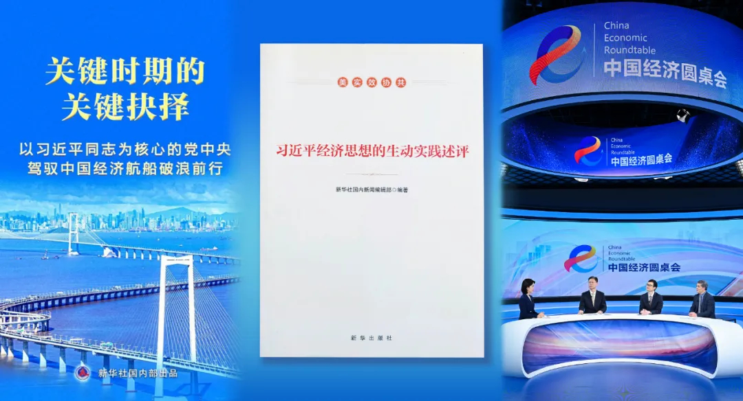 新华社持续深入学习领悟习近平经济思想的精髓要义和实践要求,把“稳预期、强信心”作为经济宣传的重要课题,全方位、多形态开展报道。图为新华社重点报道海报、《习近平经济思想的生动实践述评》图书和“中国经济圆桌会”大型全媒体访谈节目录制现场。 新华社供图