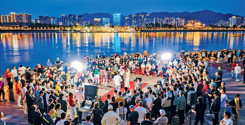 网络直播以“即时在场感”打破空间限制,成为新大众文艺的重要表现形式和载体。图为2025年5月27日,在浙江省温州市鹿城区,一个由10多名文艺爱好者组成的草根主播团队正在表演歌曲、舞蹈、小品等,他们面向市民、游客线下演出的同时,还通过线上直播的方式“献艺”。 新华社发 刘吉利/摄