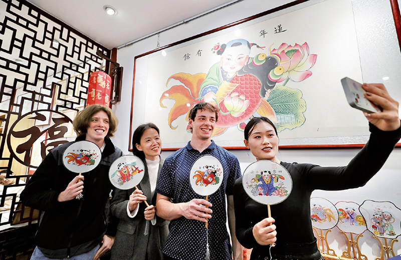 杨柳青木版年画始于明末,笔法细腻、色彩艳丽、题材丰富,是展现津派文化鲜明特征的活态样本,2006年被列入首批国家级非物质文化遗产代表性项目名录。图为2025年10月12日,来华交流的外国大学生走进天津市杨柳青古镇画庄感受彩绘年画团扇魅力。 天津市委宣传部供图