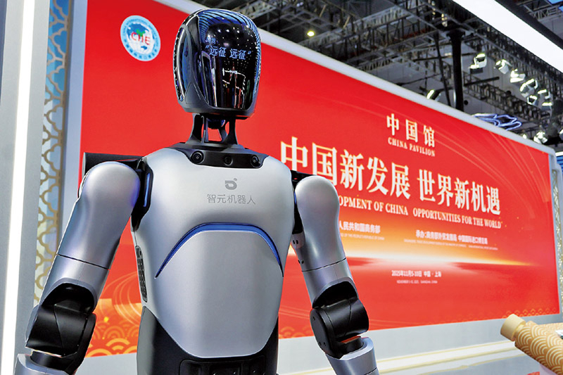 2025年11月5日至10日,第八届中国国际进口博览会在上海举办。本届进博会共有155个国家、地区和国际组织参与,4108家境外企业参展,整体展览面积超过43万平方米,规模再创新高。作为党的二十届四中全会后我国的首场重要经济外交活动,第八届进博会再次向世界郑重宣告,中国开放的大门只会越开越大。图为11月5日,在第八届进博会国家综合展中国馆展示的人形机器人。 中新社发 唐克/摄