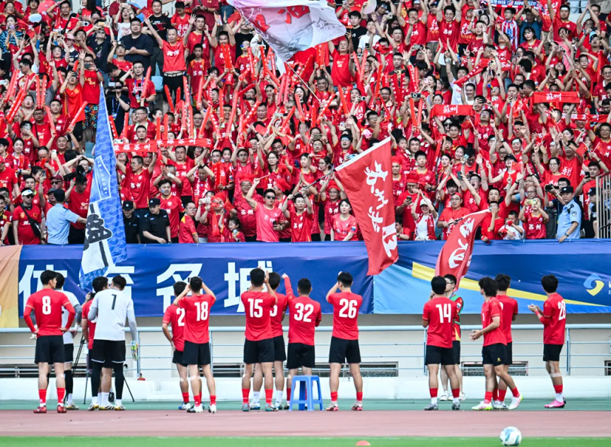 2025年7月5日,在江苏南京举行的2025年江苏省城市足球联赛第六轮比赛中,南京队主场0比0战平苏州队。图为当日,苏州队球员在比赛前向球迷致意。 新华社记者 季春鹏/摄