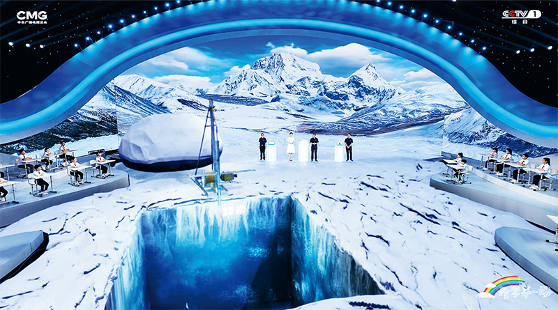 2022年《開學第一課》以“奮斗成就夢想”為主題,引導廣大中小學生更好認識和認同中華文明,鑄牢中華民族共同體意識,增強做中國人的志氣、骨氣、底氣,從小堅定聽黨話、跟黨走的決心和信心,努力實現德智體美勞全面發展,努力成長為擔當民族復興大任的時代新人。圖為中央廣播電視總臺演播廳現場,通過AR技術還原青藏高原科考取樣場景 (視頻截圖)。 中央廣播電視總臺供圖