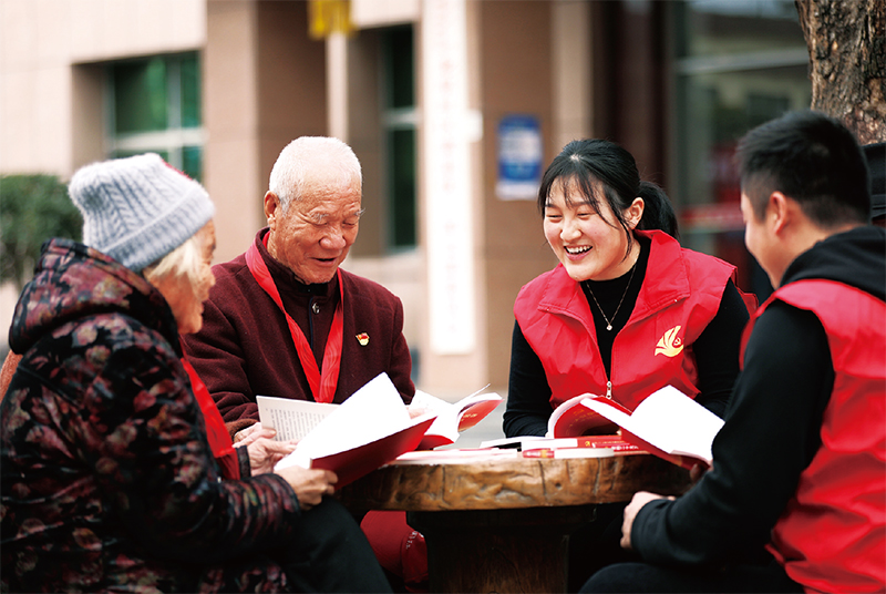 圖為2022年11月18日,山東省臨沂市郯城縣郯城街道“90后”青年黨員志愿者與龍泉社區“40后”老黨員一起學習黨的二十大精神。 人民圖片 張春雷/攝