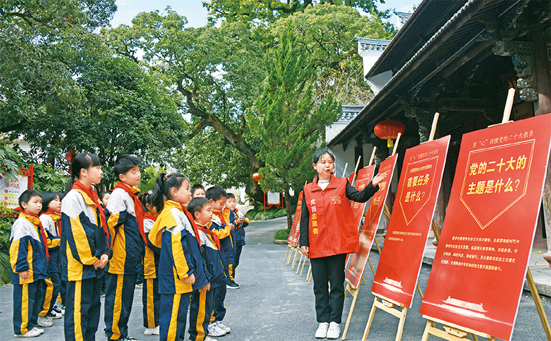 圖為2022年10月25日,浙江省臺州市上張鄉中心小學的學生在中共仙居縣委舊址紀念館學習黨的二十大精神。 人民視覺 王華斌/攝